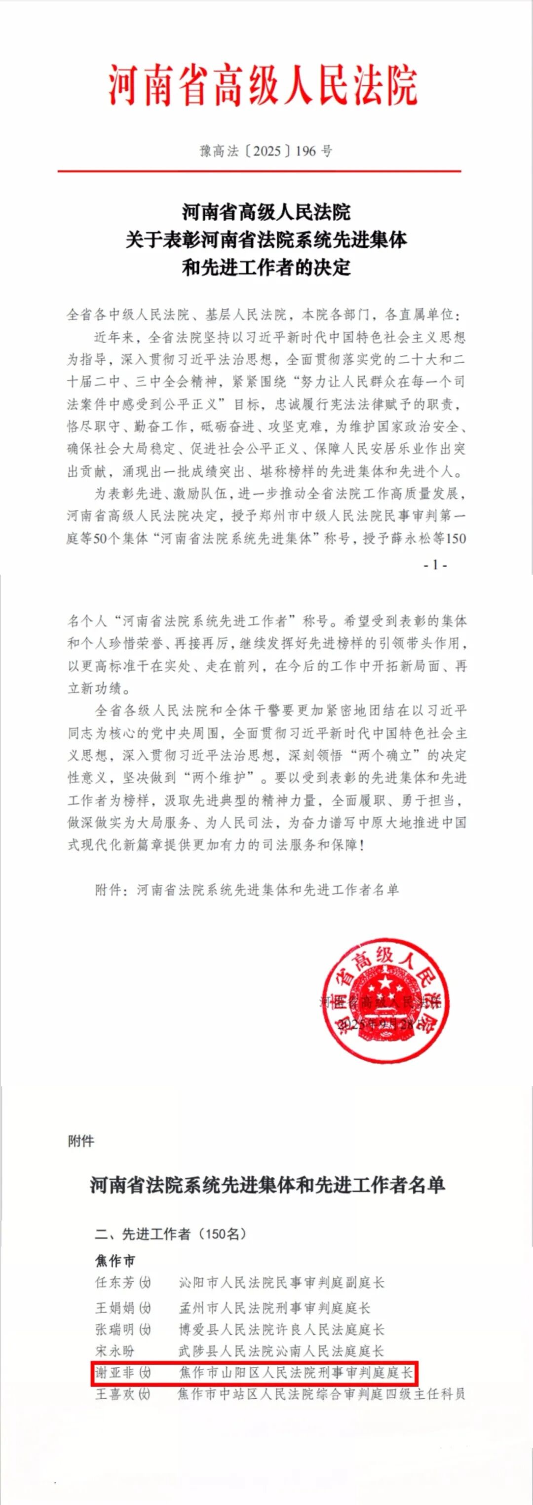 为表彰先进、激励队伍,进一步推动全省法院工作高质量发展,近日,河南省高级人民法院印发《关于表彰河南省法院系统先进集体和先进工作者的决定》,授予50个集体“河南省法院系统先进集体”称号、150名个人“河南省法院系统先进工作者”称号。其中,山阳区人民法院谢亚非被评为河南省法院系统先进工作者”称号。